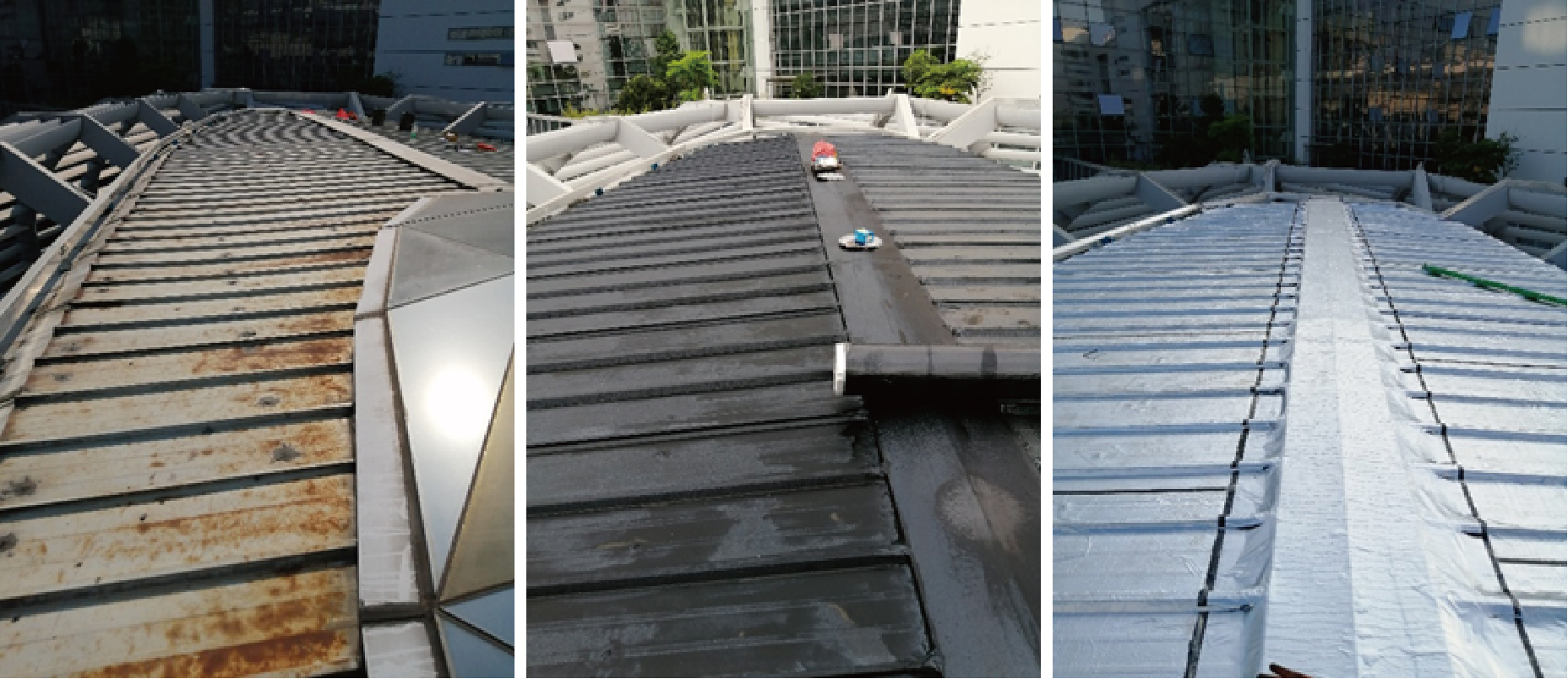 清理基層:需要盡可能的將金屬屋面原有的灰層、鐵銹以及其它雜質(zhì)盡可能的處理干凈;